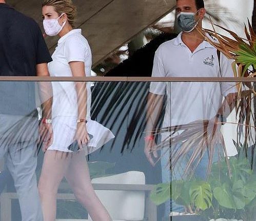 وبدت إيفانكا في الصور وكأنها عائدة لتوها من لعب التنس ؛ وكانت ترتدي قميص بولو أبيض وتنورة رياضية بيضاء صغيرة وأحذية رياضية بينما كانت تتجاذب أطراف الحديث مع الرجلين وهي ترتدي قناع وجه باللونين الوردي والأبيض ومعها كلب الأسرة الأبيض الناعم وينتر ، وكانت تحمل هاتف iPhone الأسود الكبير في يدها.