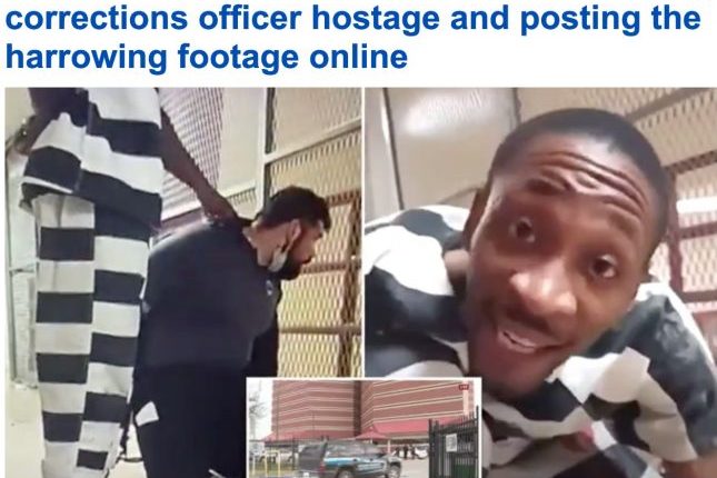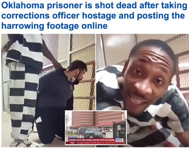 أطلق ضباط في سجن أوكلاهوما الأمريكي الرصاص على نزيل مما أدى إلى قتله، بعد أن خطف الأخير حارس السجن كرهينة وقام بسرقة مفاتيحه لإطلاق سراح زملائه الآخرين، الذين قاموا بعد ذلك ببث الحادث المروع.