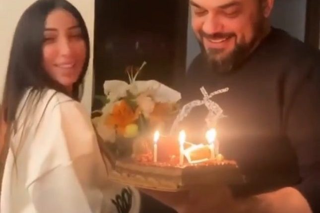 ويظهر في الفيديو دنيا بطمة تحتفل بعيد ميلاد زوجها محمد الترك، حيث قدمت له الورود وقالب حلوى.