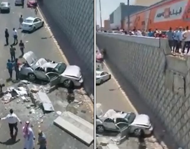 وظهر في المقطع تأثر السيارة وتضررها بشكل كبير بعد سقوطها من ارتفاع الجسر.
