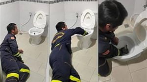 وتكشف لقطات فيديو، لأحد العاملين بخدمة الطوارئ، وهو مستلقى على أرضية المرحاض يزحف- حتى لا يراه الثعبان- الذي كان يخرج رأسه من فوق حافة المرحاض، ويتحرك ببطء شديد، حتى لا يخيف الثعبان ويجبره على التراجع مرة أخرى إلى المجاري.