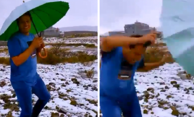 وأبان المقطع أن الشخص انتفض في مكانه وسقطت المظلة والجوال من يده بعد الصاعقة التي ضربت المكان الذي يقف فيه، ونجا في اللحظات الأخيرة.