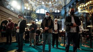شهد مسجد آيا صوفيا في اسطنبول، اليوم الخميس، إقامة صلاة عيد الفطر للمرة الأولى منذ 87 عاما، بعد إعادة افتتاحه في شهر يوليو من العام الماضي.