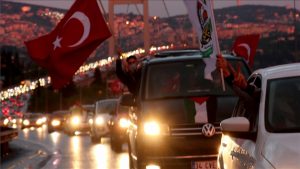 وحمل المحتجون الأعلام التركية والفلسطينية خلال تجولهم في أرجاء المدينة، حيث أدانوا جرائم الاحتلال الإسرائيلي بحق الشعب الفلسطيني، وسط تفاعل ودعم الكثير من المواطنين المارة أثناء مرور القافلة.
