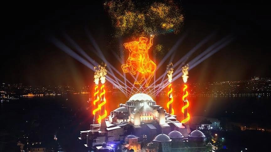 وبدات الاحتفالات بتلاوة القرآن في مسجد آيا صوفيا الكبير، أعقبت ذلك إضاءة برج غلطة سراي في إسطنبول، بصورة السلطان محمد الفاتح وهو في 21 من عمره.