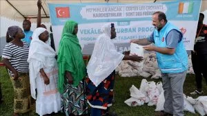 وزعتوقف الديانة التركي لحوم الأضاحي في كوت ديفوار على 40 ألف أسرة محتاجة .كجزء من مشروع يستهدف المحتاجين في جميع أنحاء العالم.