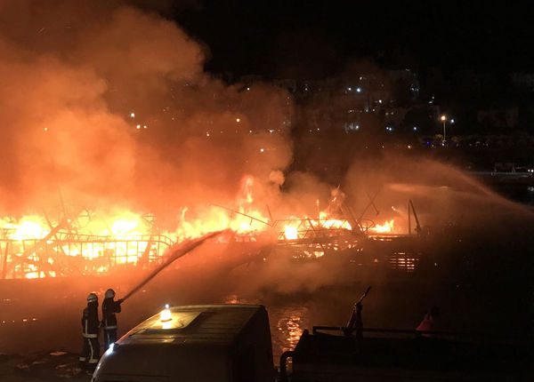 اندلع حريق كبير في قارب سياحي امتد إلى 3 قوارب أخرى في ميناء توركلار في مدينة ألانيا جنوب تركيا .