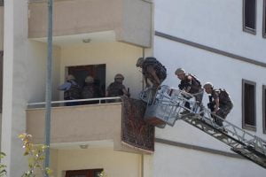 وقامت الفرق بدخول منزل المشتبه به في الطابق الثالث بسلم عربة الإطفاء عبر الشرفة وفتحوا الباب المغلق ثم دخلوا وألقوا القبض على الجاني .