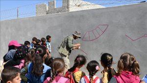 وفي ذات السياق قام الرسّام التركي يلدريم بالرسم على جدار دار أيتام في الباب، برفقة أطفال أيتام هناك.