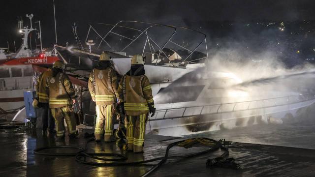 اندلع حريق كبير في قارب راسي على شاطئ منطقة بشيكتاش في مدينة إسطنبول غرب تركيا .