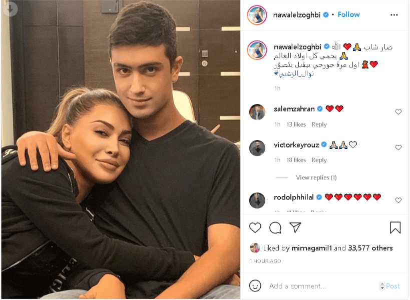 وبدت نوال الزغبي (50 عامًا) في الصورة وهي تضع رأسها على كتف ابنها، أما هو فكان يحتضنها، وأرفقت الصورة بتعليق قالت فيه: ”صار شاب الله يحمي كل اولاد العالم أول مرة جورجي بيقبل يتصوّر“.