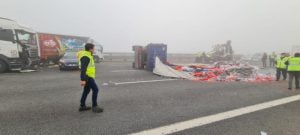 وأضافت أن شاحنتان وسيارة وشاحنة أخرى اصطدموا من الخلف في الشاحنة المنقلبة .