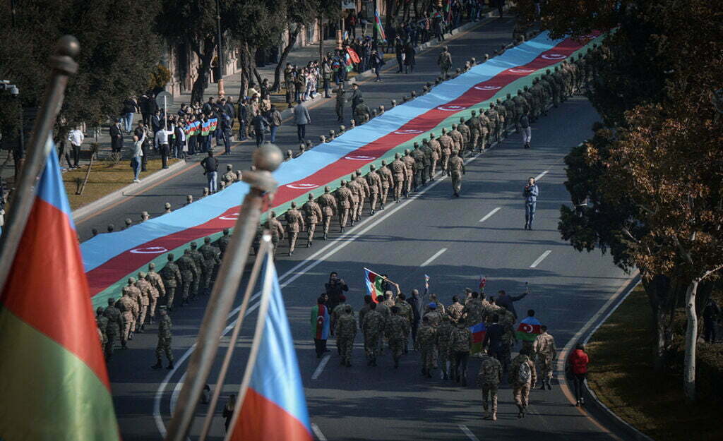ذكرت وسائل إعلام محلية أن تركيا شاركت بوفد رفيع المستوى في احتفالات أذربيجان ذكرى النصر على أرمينيا، في الوقت الذي شهدت فيه الاحتفالات تشكيل “قبضة حديدية” بشرية، وأسفلها كتابة عبارة “يوم النصر”.