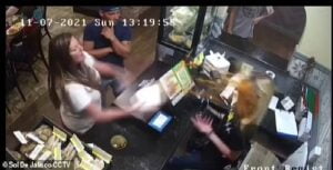وقالت الصحيفة إنه بحسب المقطع الذي وثقته الكاميرات الأمنية بالمطعم. عادت الفتاة إلى المطعم وتحدثت مع العاملة، وفجأة ألقت المشروب في وجهها ثم غادرت غرفة المطعم.