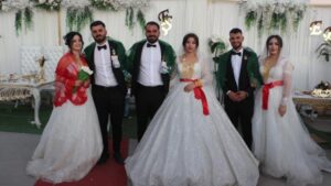 أقام مواطن تركي يدعى يوسف بيلجيك حفل زفاف جماعي لأبنائة الثلاثة شيفان وبرغوفان وكريم في يوم واحد في منطقة سيلوبي بمدينة شرناق جنوب شرق تركيا .