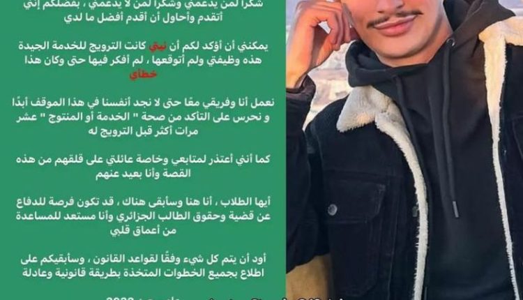 المؤثر العشريني سبق ونفى صلته المباشرة بالاعتداءات التي طالت الطلبة من طرف الوكالة، وأكد انه لم يكن على علم بالموضوع إلى أن تفجر مؤخرا، وقال “يمكنني أن أؤكد لكم أن نيتي كانت الترويج للخدمة الجيدة هذه وظيفتي ولم أتوقعها لم أفكر فيها حتى وكان هذا خطأي”
