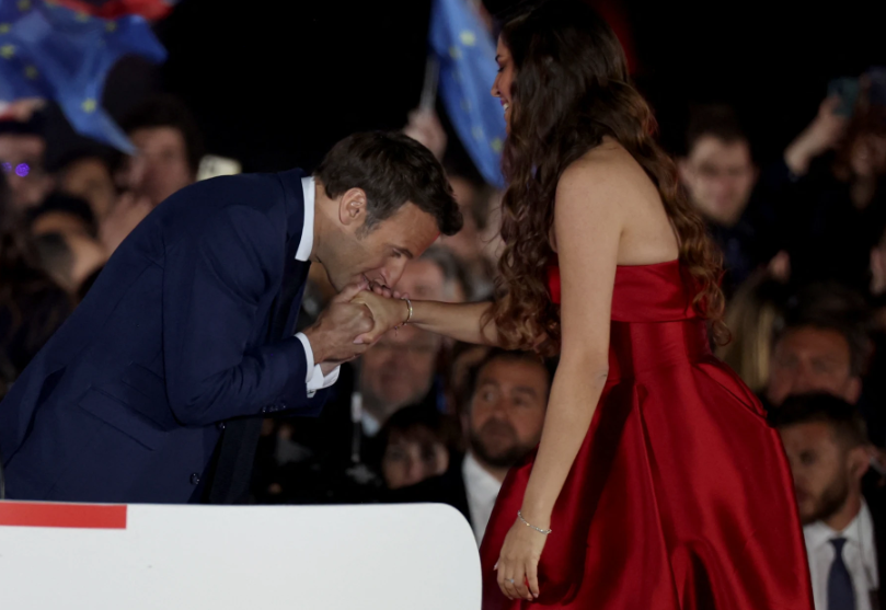 قبل الرئيس الفرنسي إيمانويل ماكرون يد مغنية الأوبرا المصرية فرح ديباني بعد أن غنت النشيد الوطني الفرنسي في الاحتفال عقب فوزه في الانتخابات الرئاسية يوم الأحد.