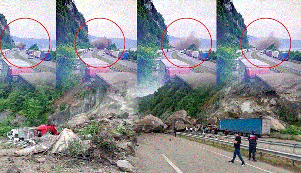 وقالت وسائل إعلام، أن صخور عملاقة تدحرت على الطريق أثناء مرور شاحنة ضخمة على الطريقة حيث تضررت بشكل كبير نتيجة الانهيار الارضي .