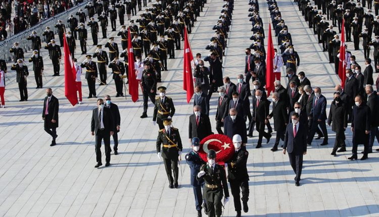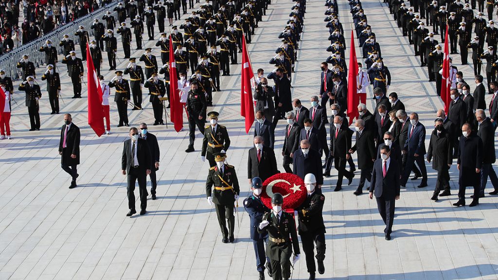 ووضع تشاووش أوغلو والسفراء إكليلاً من الزهور على ضريح أتاتورك، قبل أن يقفوا دقيقة صمت إجلالاً لروحه.