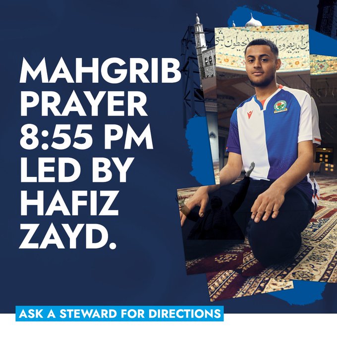 وأصدر نادي بلاكبيرن روفرز بيانا رسميا للإعلان عن توفير مصلى للجماهير المسلمة في مباراة الفريق مع هارتلبول يونايتد، حيث يتقاطع موعد المباراة مع توقيت صلاة المغرب.