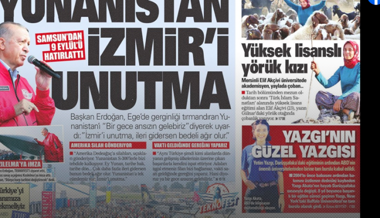 وتناولت الصحف التركية مثل صباح وحريت وملليت وتركيا تصريحات أردوغان التي خاطب بها اليونان من مدينة سامسون التركية قائلا: أيتها اليونان “انظري إلى التاريخ، إذا تماديتِ أكثر فسيكون ثمن ذلك باهظا، لدينا جملة واحدة لليونان، لا تنسي (كيف طردناكم من) إزمير”