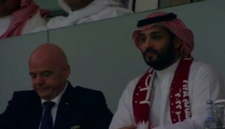 توشح ولي العهد السعودي الأمير محمد بن سلمان العلم القطري خلال افتتاح كأس العالم في استاد البيت بالدوحة .