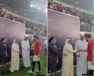 وسرعان ما مدت السيدة يدها إلى صلاح لكن اللاعب الملقب بـ “فخر العرب” لم تصافحه وأخذت مكانه لالتقاط صورة تذكارية أثناء تسلمه الجائزة.