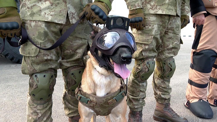 وقالت وزارة الدفاع التركية إن الكلاب ترتدي نظارات الرؤية الليلية المزودة بقدرة الأشعة تحت الحمراء للبحث في المناطق التي لا يمكن رؤيتها على الفور من الخارج .