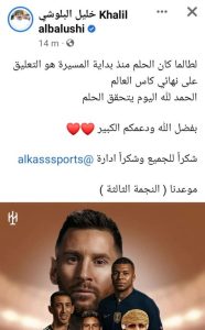 وكتب البلوشي عبر صفحته على موقع التواصل الاجتماعي فيسبوك منذ قليل: لطالما كان الحلم منذ بداية المسيرة هو التعليق على نهائي كأس العالم.. الحمد لله اليوم يتحقق الحلم.. بفضل الله ودعمكم الكبير,, شكراً للجميع وشكراً ادارة الكأس.