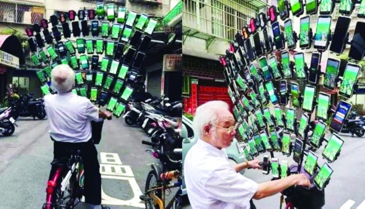 أثار مسن تايواني 74 عامًا ضجة على مواقع التواصل الاجتماعي بسبب انغماسه الشديد بلعبة إلكترونية تفاعلية لدرجة أن هناك 64 هاتفاً موصولاً بدراجته من أجل اللعب .