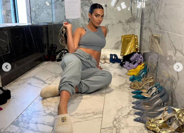 ظهرت جورجينا في الصور المتداولة على نطاق واسع بإطلالة جريئة للغاية، وبدت مرتدية بلوزة باللون السكني كشفت خلالها منطقة الخصر بشكل فاضح وأكملت الإطلالة ببنطال من نفس اللون وحذاء مفتوح.