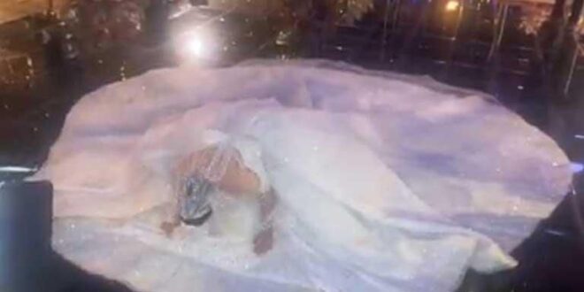 حيث سجدت على الأرض؛ خلال قيام المصورين بالتقاط صور لها احتفالاً بزفافها على حسن شاكوش.