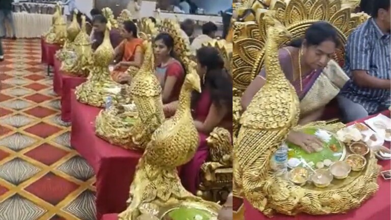 تداول رواد مواقع التواصل الاجتماعي مقطع فيديو من حفل زفاف في الهند، ظهر خلاله الضيوف يجلسون للعشاء وأمامهم صحون على شكل طاووس مطلي بالذهب.