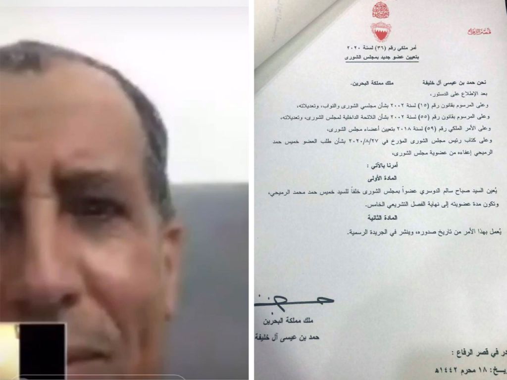 أصدر ملك دولة البحرين حمد آل خليفة، الأحد الموافق 6 سبتمبر ، أمر ملكي يأمر بتعيين صباح الدوسري كعضو في مجلس الشورى بدل النائب السابق خميس الرميحي الذي قدم استقالته بالإجبار.