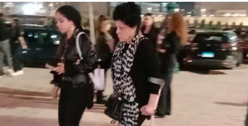 حضرت الفنانة المصرية إسعاد يونس، عزاء والد الفنانة دينا الشربيني، وظهرت وهي تتكئ على عكاز.