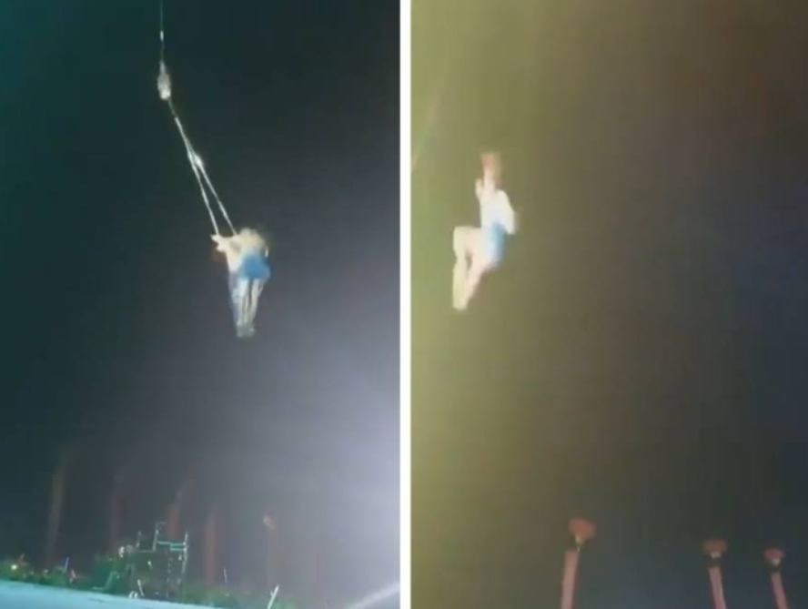 ظهرت الفنانة الصينية صن مومو البالغة من العمر 37 عام وهي تسقط من يدي زوجها خلال عرض على شكل أرجوحة.