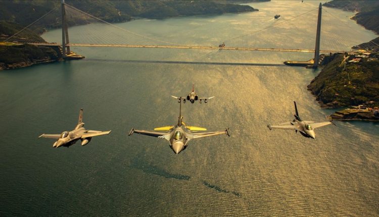 وتضمنت الصور طائرات حربية من طراز ” SOLOTÜRK ” و”F-4E” و”F-4E/2020″ و”F-16″ تلقي التحية فوق مضيق البوسفور والقرن الذهبي وسراي بورنو وآياصوفيا.