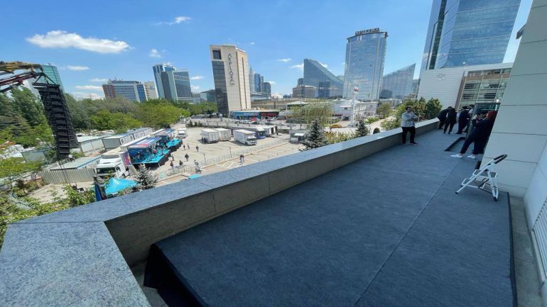 يُجهز حزب العدالة والتنمية المكان والشرفة التي يلقي فيها أردوغان خطابه بعد الاعلان عن نتائج الانتخابات.