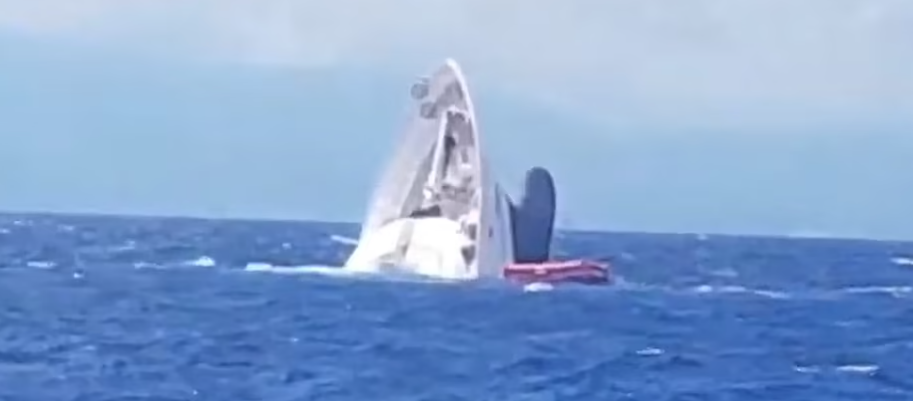 غرق اليخت في الماء بعد إعادته إلى الرصيف وربطه بالحبال.