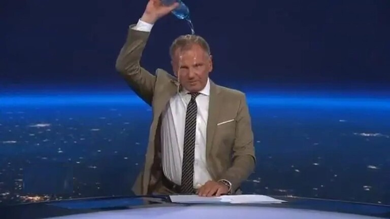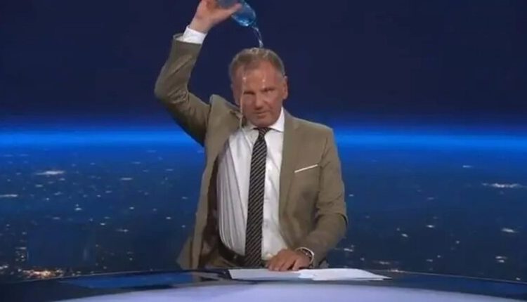 إعلامي شهير يسكب الماء على رأسه في نهاية نشرته الإخبارية والسبب مفاجئ “فيديو”