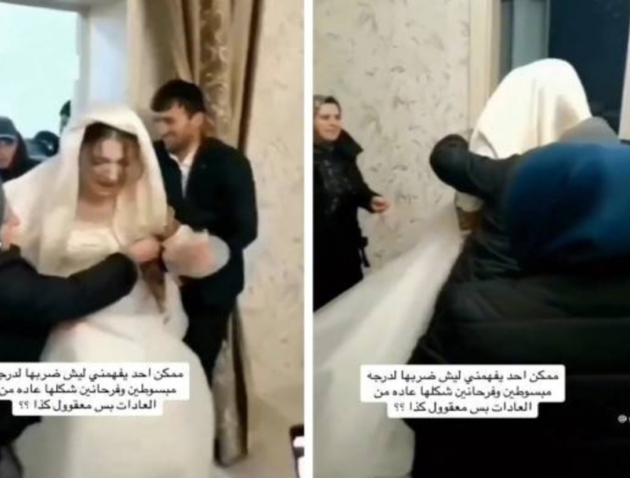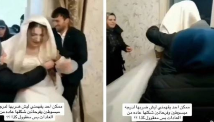 تم تداول مقطع فيديو على مواقع التواصل الاجتماعي يوثق لحظة قيام عريس بضرب عروسه على رأسها في حفل زفافهما، وسط فرحة الأهل والأصدقاء.