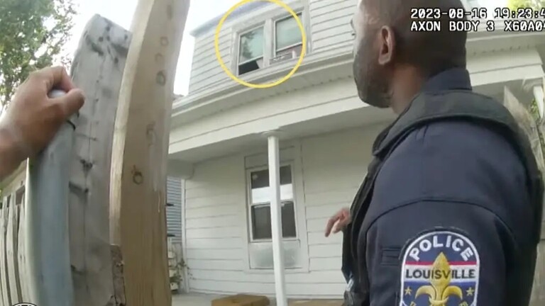 ظهر في الفيديو المتداول على نطاق واسع ضابط شرطة من ولاية كنتاكي وهو يحاول دخول المنزل من الباب الرئيسي، إلا أنه فشل في ذلك.
