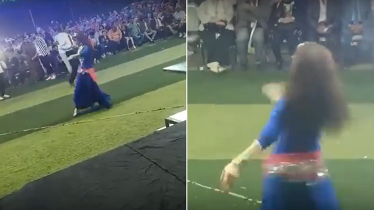 بدت الراقصة في الفيديو المتداول على نطاق واسه مرتدية فستانًا أزرق اللون وتقوم بحركات راقصة وتهز خصرها بينما يشاهدها مجموعة من الطلاب والمسؤولين الجالسين في الملعب.