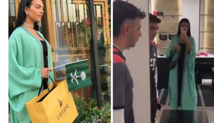 أظهر الفيديو جورجينا وهي تتسوق في أحد المتاجر في العاصمة الرياض، وترتدي عباءة بلون قريب من اللون الأخضر، الذي يعتبر لون العلم السعودي.