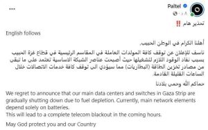 أعلنت شركة الاتصالات الفلسطينية، الأربعاء، عن توقف خدمات الاتصالات والإنترنت خلال الساعات القادمة في قطاع غزة.