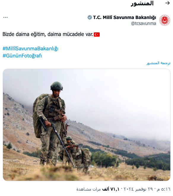 وقالت الوزارة في منشورها: “دوماً تدريبات، دوماً كفاح!”، وهو ما فُسر على أنه تلميح إلى دور التدريبات العسكرية المستمرة في رفع جاهزية القوات، خاصة في ظل التطورات الأخيرة في الشمال السوري.