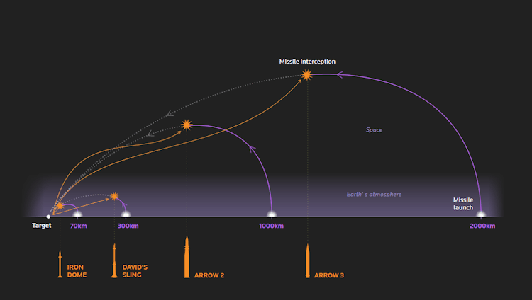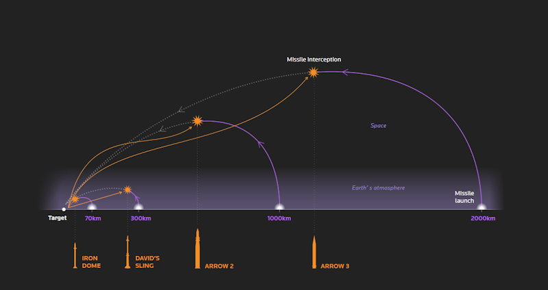 الطبقات الخارجية تشمل منظومتي “السهم-2” و”السهم-3″، المصممتين لاعتراض الصواريخ الباليستية التي تُطلق من آلاف الكيلومترات بعيدًا.