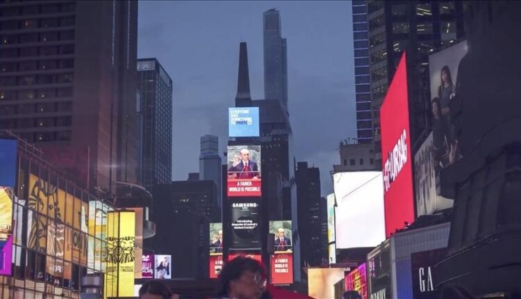 وجاء عرض مقولة الرئيس أردوغان باللغة الإنجليزية على شاشات شوارع نيويورك، نتاج جهود وتنسيق لدائرة الاتصال التابعة للرئاسة التركية.