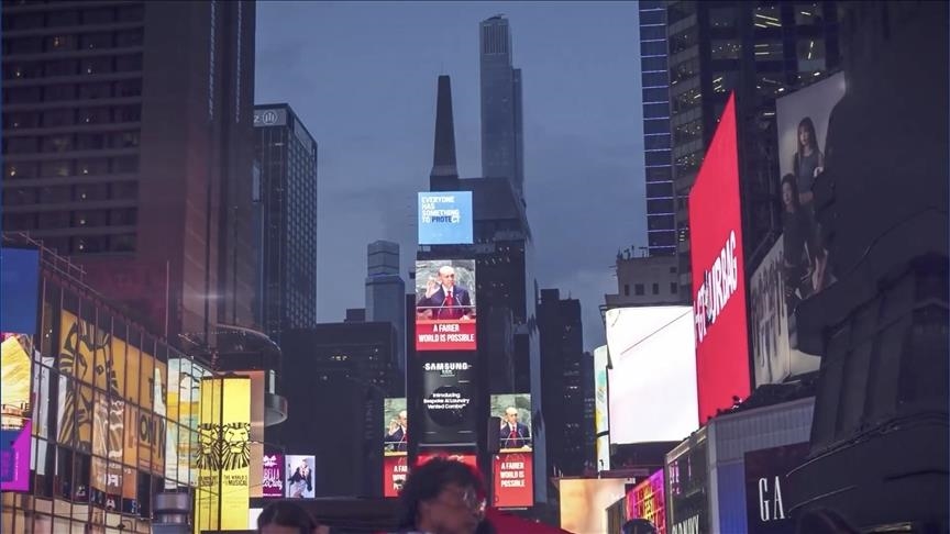 ظهرت مقولة للرئيس التركي رجب طيب أردوغان، على شاشات “ميدان التايمز” والشوارع الرئيسية في مدينة نيويورك الأمريكية.